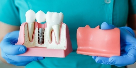 Dental implants are screw-shaped posts that are made to be inserted into your jawbone. They’re made out of biocompatible materials (usually titanium) that can fuse with the bone tissue, giving them chewing strength and stability on par with natural teeth. Once the mouth has healed after implant surgery, a metal abutment is attached to each post. The abutment is what eventually anchors a crown, bridge, or denture to the post in order to restore your smile.